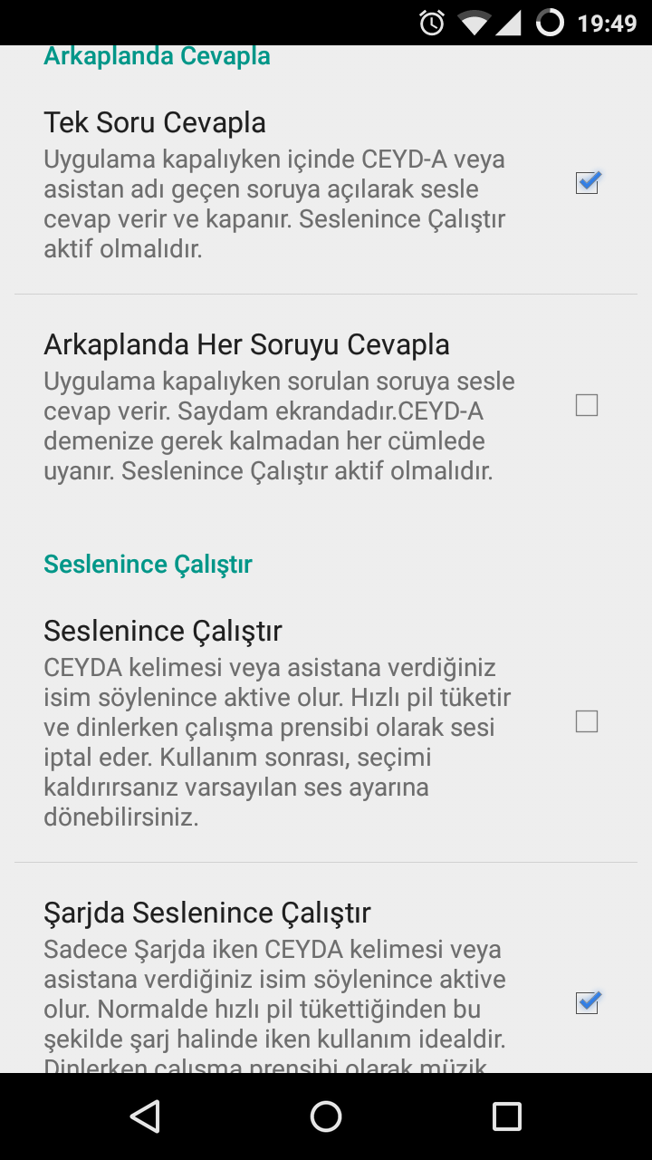 Eğer seslenince çalıştır aktive edilirse, CEYD-A kapalı olduğunda ekranın üst köşesinde kırmızı mikrofon görünür. Bu aşamada CEYD-A arka planda sizden komut/soru bekler yani tetikte bekleyerek sizin kelimelerinizi algılamaya çalışır. Ayarlarda 4 çeşit arka planda algılama yöntemi vardır. İhtiyaca göre belirleyebilirsiniz: