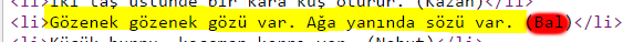 Control-U tuşlarına bastığınızda bu sayfanın kaynak kodlarını göreceksiniz. Farkedileceği gibi her satır <li> tagleri içindedir. Ayrıca bilmece cevabı ( ) parantezler içindedir.
