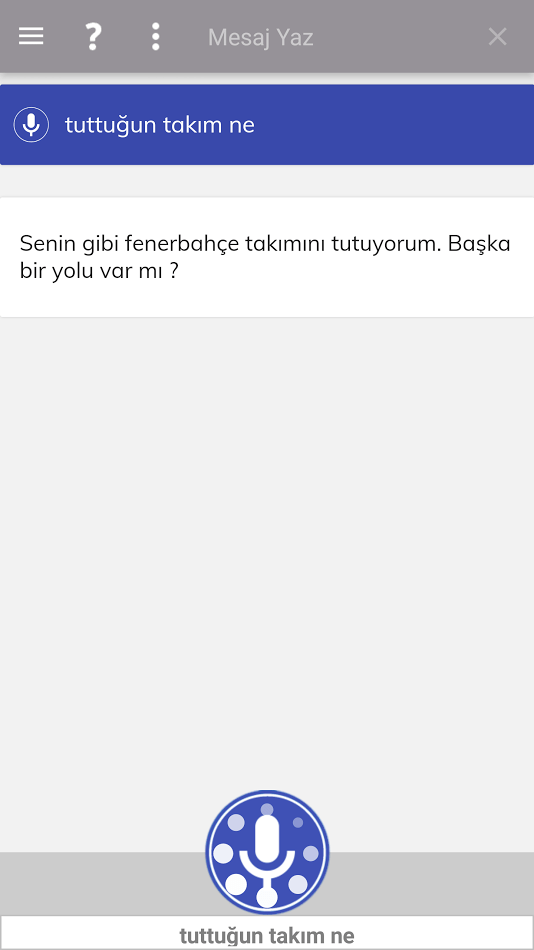 Tuttuğunuz takımı CEYD-A ya söyledikten sonra artık onunla bu konuda sohbet etmek mümkün. Artık tuttuğunuz takımı ve rakiplerini tanıyan bir CEYD-A var. Örnekte tuttuğum takım Fenerbahçe dedikten sonra CEYD-A ile yapılan kısa bir sohbet: