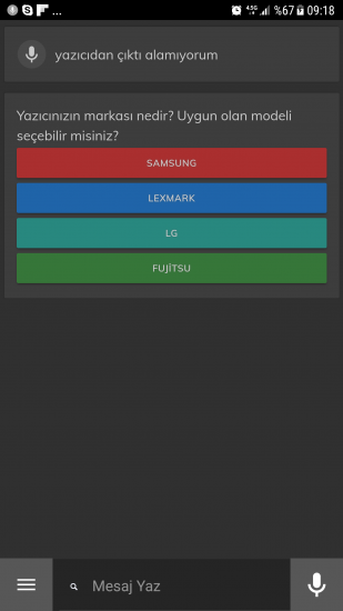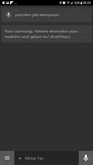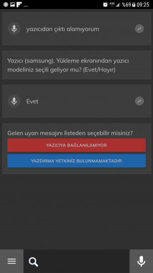 Aşağıdaki örnekte Yazıcıdan çıktı alamıyorum denildiğinde sizi sorular ve seçeneklerle yönlendiren küçük bir yardım modülünü bulabilirsiniz. Komutları https://kodla.ceyd-a.com sayfasından girmek mümkün. Girilen komutlar aynı kullanıcı isimli cihaz(lar)ınıza otomatik olarak yüklenmektedir.