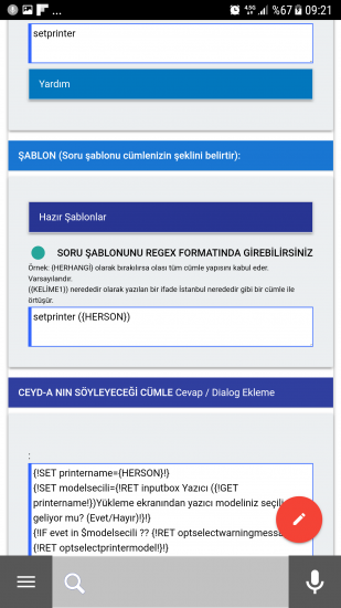 Aşağıda bu yardım modülünü işleten komutlar bulunmaktadır. Her biri için komut ekle seçeneği seçilerek SORU,ŞABLON ve CEVAP alanları doldurulmalıdır.