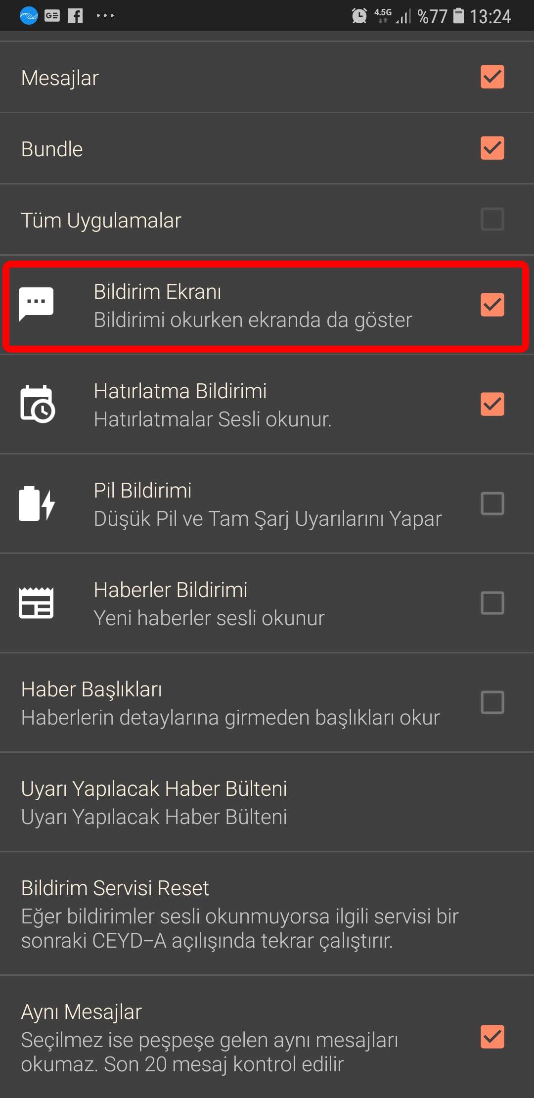 Ayrıca, eğer sadece sesli değil ana ekrana da gelen mesajın alt yazı şeklinde gösterilmesi için