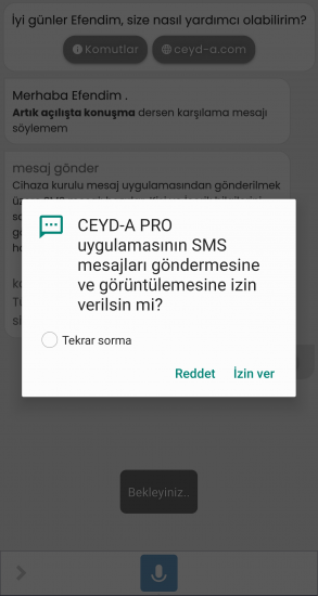 CEYD-A uygulaması ile sesli olarak SMS gönderimi yapabilirsiniz. Mesaj Gönder dediğinizde eğer daha önceden izin vermediyseniz aşağıdaki gibi sistem izni sizden istenecektir. SMS gönderimi ve Rehberden kişinin telefonunu öğrenebilmesi için gerekli izinleri veriniz.