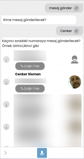 Mesaj gönder cümlesini söyledikten sonra eğer cihazınızdaki rehberde aynı isimden birden fazla kişi var ise size bir liste gelecektir. Mikrofon otomatik olarak devreye girecektir tekrar mikrofona basmayınız. Hangi sıradaki isme mesaj göndermek istiyorsanız sıra numarasını söyleyiniz. Örneğin 2. (ikinci) gibi.
