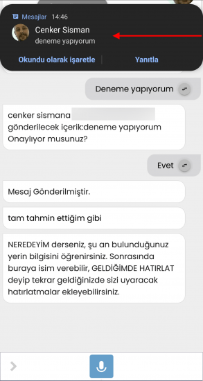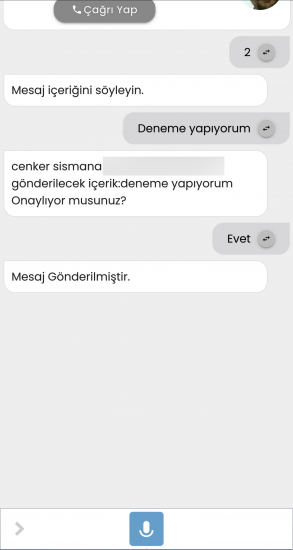 İçeriği söyledikten sonra size Onaylıyor musunuz diyecektir. Evet deyiniz. Mesaj gönderilecektir. Aşağıda gönderilen bu mesajın gelme anı gösterilmiştir.