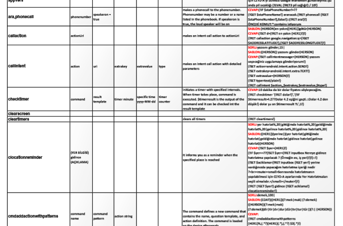Tüm Yazılar Yazar: Cenker Sisman · Yayımlanmış 4 Eylül 2020 · Güncellendi 12 Ocak 2021 CEYD Komut Seti ve ÖrneklerGenel, Komut Yazımı Örnekleri17/11/20 CEYD-A Türkçe Geliştirilebilir Asistan Nedir?Tanıtım23/10/22 CEYD-A Görsel BilgiHaberler03/06/18 Komut veya Event (Olay) TanımlamaGenel, Komut Yazımı Örnekleri18/04/20 CEYD-A destekli Robotik Konuşma ve Yüz Tanıma ProjesiHaberler28/05/18 Çerez Politikası13/08/19 CEYD-A Destekli EkoRob: Kampüs Kılavuzu İnsansı RobotGenel, Haberler21/05/18 CEYD-A HatırlatmalarıÖzellikler08/05/18 CEYD-A ile Yapılan Akademik ÇalışmalarHaberler03/04/19 IoT Line Fair 2018, CEYD-A Sunumu ArdındanHaberler07/05/18 Çoktan Seçmeli Test ÖzelliğiKomut Yazımı Örnekleri, Özellikler07/05/18 Sorulan Cümleyi Web Servisinden Bilgi Çekerek Sorgulama ve YorumlamaKomut Yazımı Örnekleri05/05/18 Komut içinde Komut TanımlamaKomut Yazımı Örnekleri07/05/18 Örnek Komutlar: Ne Giysem ?Genel08/04/18 CEYD ile Derin Öğrenme Algoritmalarına GirişGenel26/03/18 ÖncekiSonraki